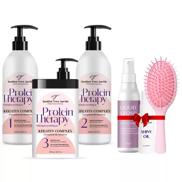 Protein therapy kondicionierius (1000g): Aqua, Cetearyl Alcohol, Behentrimonium Chloride, Glycerin, Cyclopentasiloxane, Dimethiconol, Hydrolyzed Silk, Hydrolyzed Keratin, Aloe Barbadensis Leaf Juice, Panthenol, Parfum, Isopropyl Alcohol, Phenoxyethanol, Ethylhexylglycerin, Citric Acid, Methylchloroisothiazolinone, Methylisothiazolinone, Sodium Benzoate, Potassium Sorbate, Methylparaben, Ethylparaben, Propylparaben, Butylparaben.